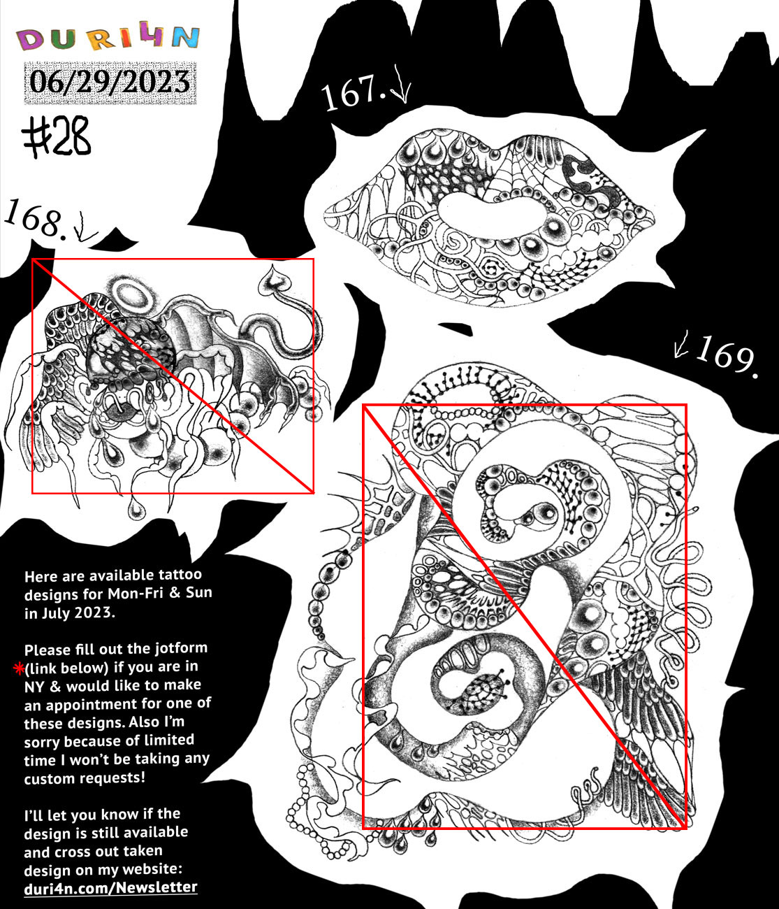 *(UPDATE: crossed out designs are no longer available!) Above are tattoo designs for Mon-Fri & Sun in July. Please fill out [this jotform] if you are in NY and would like to get one of the designs above tattooed. There’s a bunch of flash still available in past newsletters too!